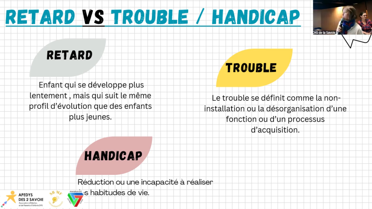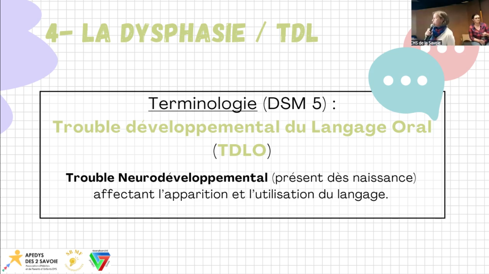 Pour la dysphasie (« trouble développemental du langage oral : TDLO »), il est également important de distinguer la difficulté transitoire dans l'acquisition du langage oral, du trouble sévère et durable qui affecte l'apparition et l'utilisation du langage. Ces troubles peuvent toucher l'expression, la compréhension, l'articulation. Là encore les conférencières expliquent les axes de la rééducation, donnent des conseils pour les parents et pour les aménagements scolaires, précisent les signaux d'alerte qui doivent orienter vers les professionnels.