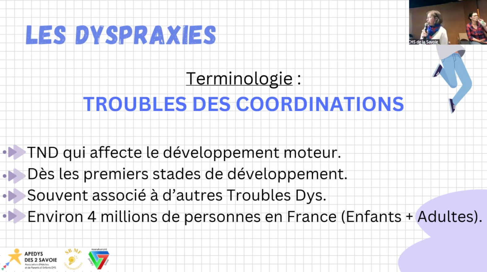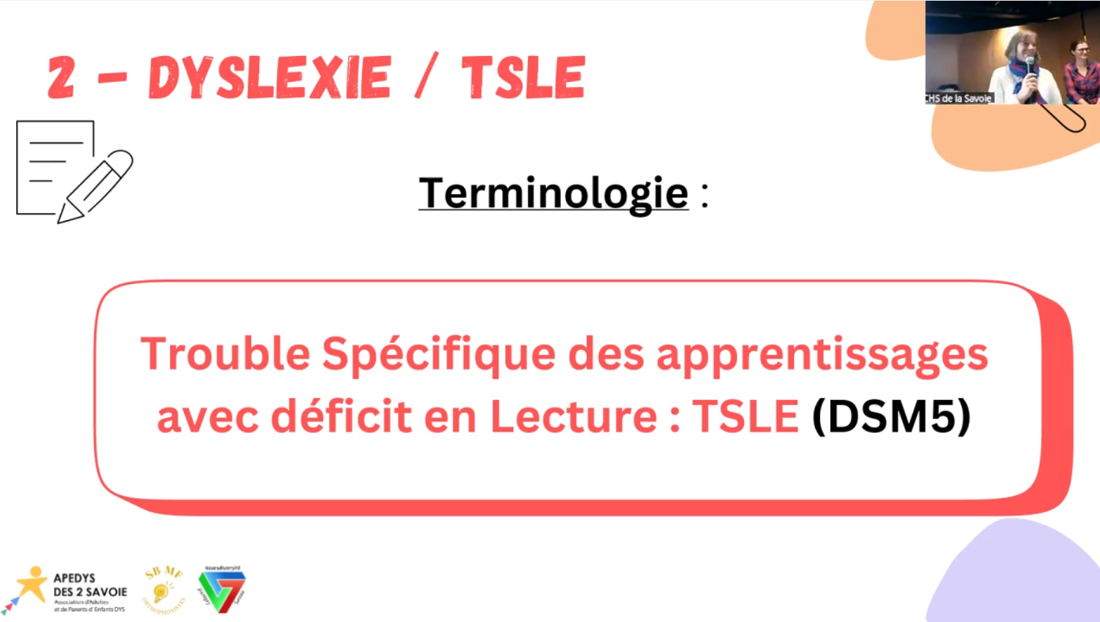 - Une présentation de différents troubles DYS associés aux nouvelles terminologies : TSLE (Trouble Spécifique du Langage Ecrit), TDLO (Trouble développemental du Langage Oral), TSAM (Trouble Spécifique des Apprentissages en Mathématiques), TDAH et autres DYS (Troubles des Coordinations).