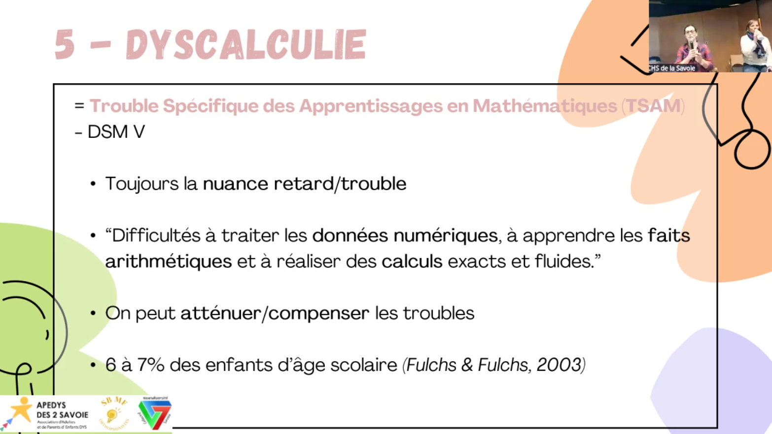La dyscalculie (« trouble spécifique des apprentissages en mathématique : TSAM »), trouble souvent associé à d'autres dys, concerne 6 à 7 % des enfants d'âge scolaire. Les enfants ont des difficultés avec le sens des nombres, les chiffres et les calculs, la résolution des problèmes ….