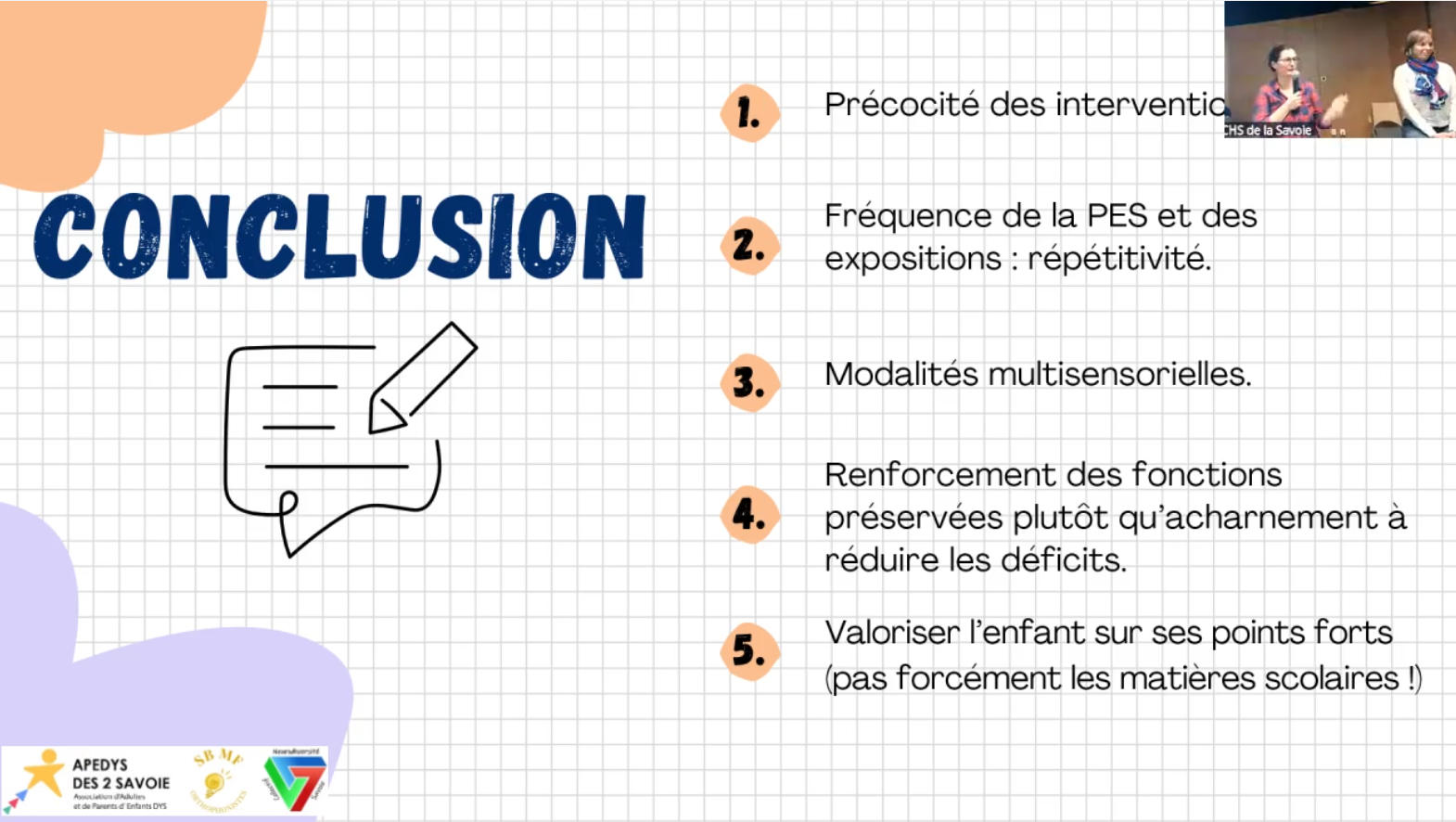 En conclusion, Stéphanie Bornand et Marie Faure insistent sur la nécessité de la précocité des prises en charge et sur la répétitivité, sur la priorité donnée aux fonctions préservées et la nécessité de valoriser l'enfant y compris hors du cadre scolaire.