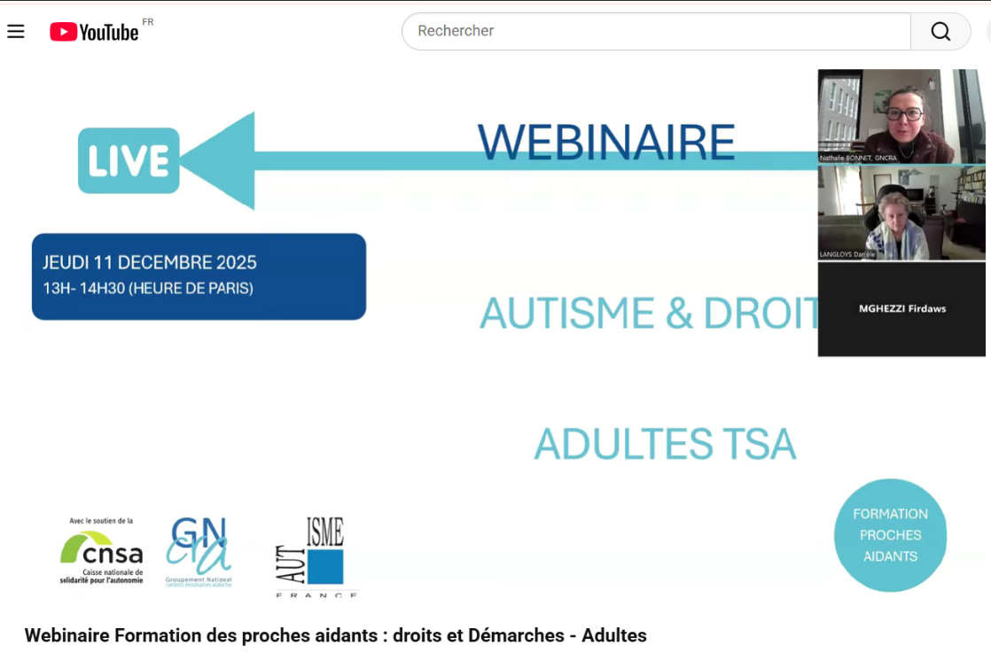 Dans le cadre de la formation des Proches Aidants, le GNCRA (Groupement National des Centres Ressources Autisme) vous propose un webinaire sur les Droits et Démarches - Adultes TSA. Durant une heure trente, Danièle LANGLOYS, Présidente d'Autisme France, nous présente des éléments juridiques ainsi que les solutions de recours possible. Ce webinaire s'adresse principalement aux proches aidants et personnes concernées, mais est également ouvert aux professionnels souhaitant se sensibiliser à cette thématique.